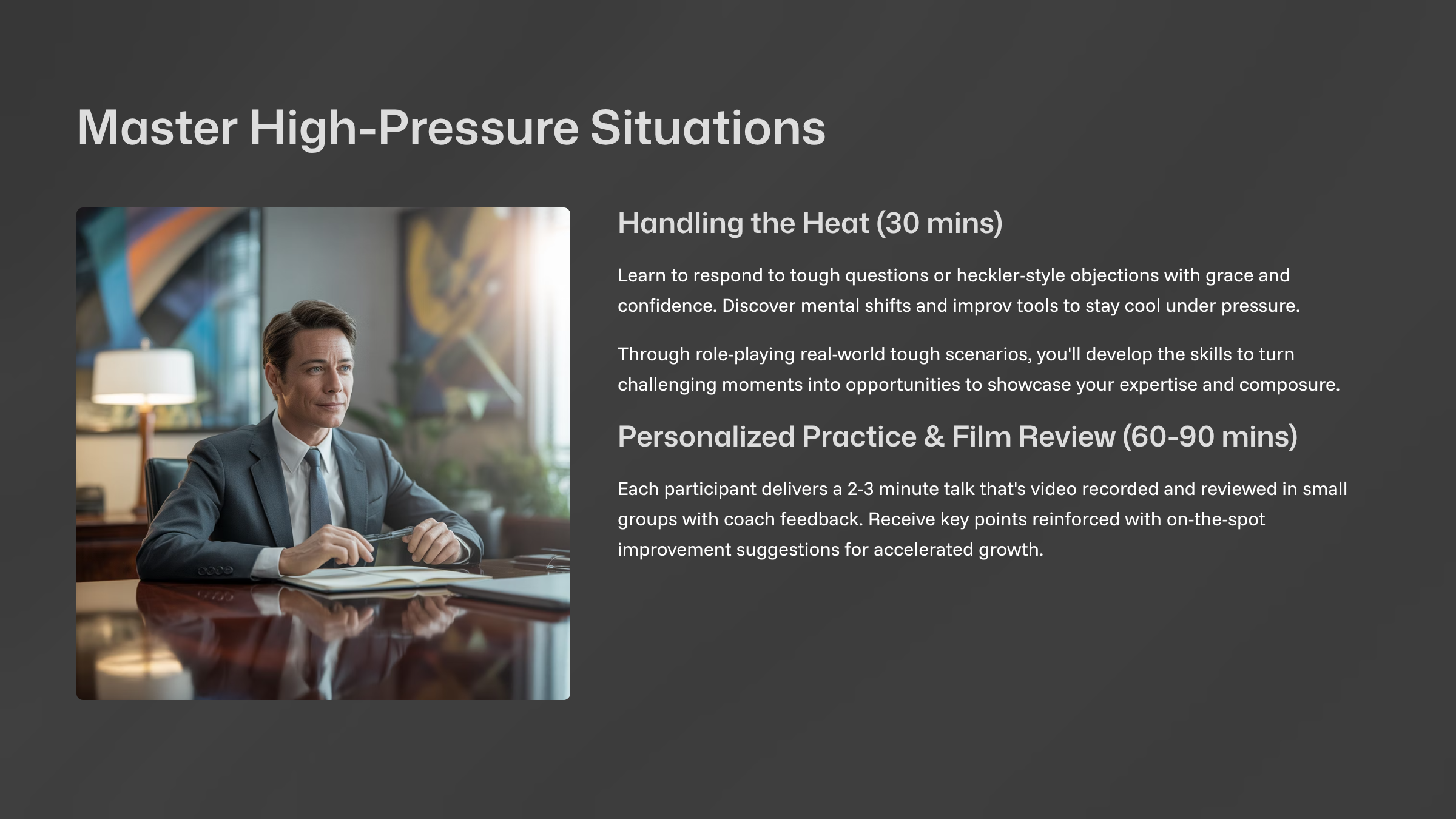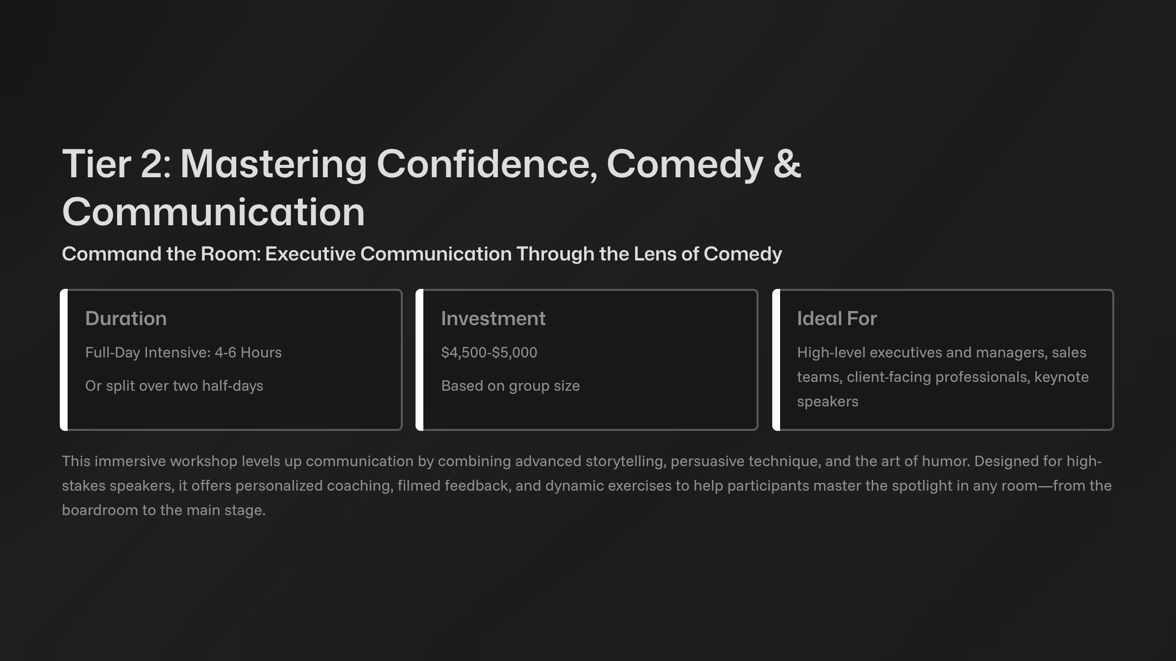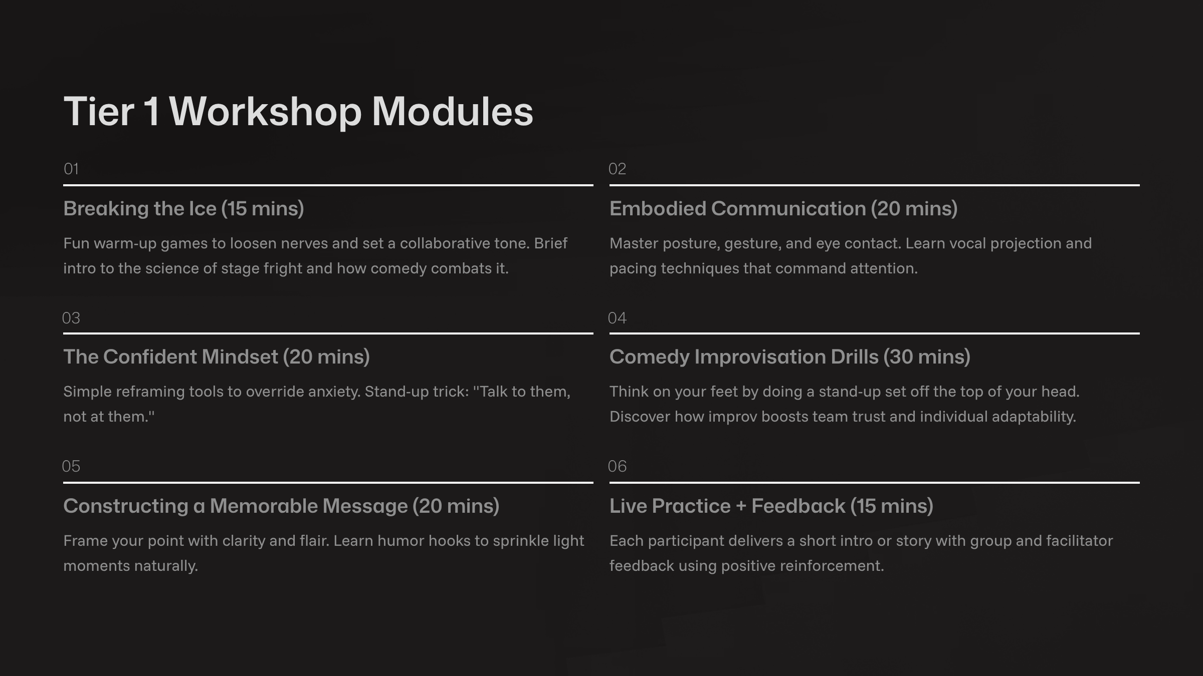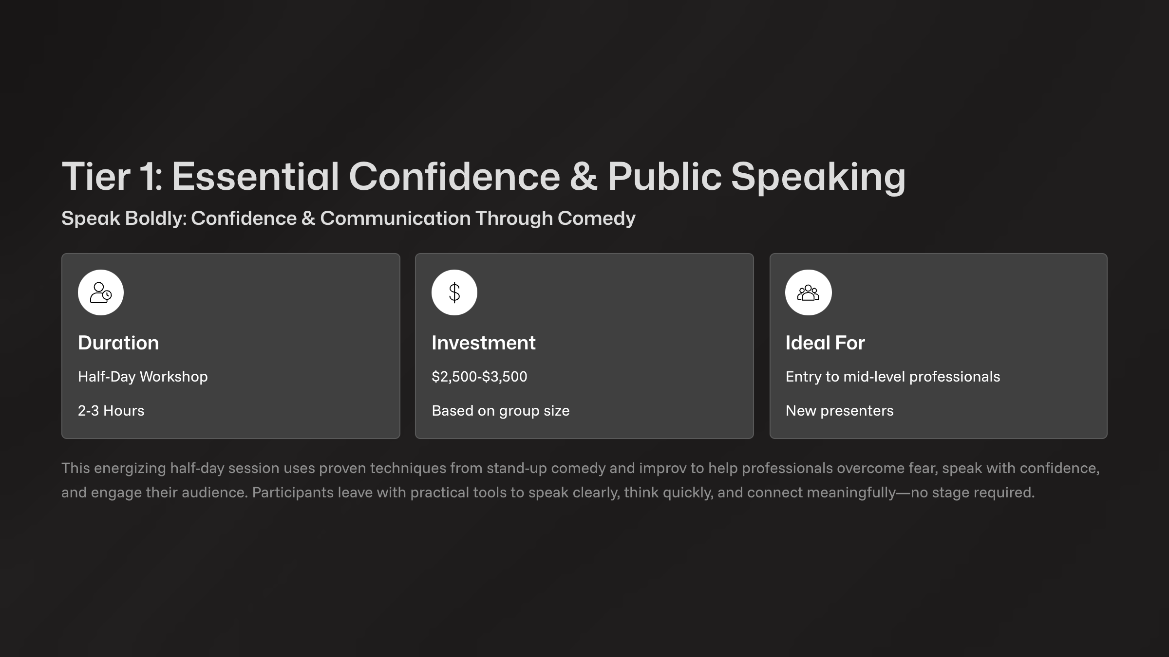 Dan Galea is a seasoned comedian, producer, and public speaking coach with over 20 years of experience on stage and behind the scenes. A Just for Laughs alumnus and long-time educator, Dan blends stand-up comedy and improvisation to help teams boost confidence, communicate clearly, and connect authentically. His workshops transform stage fright into stage presence, empowering professionals to speak boldly in any room.